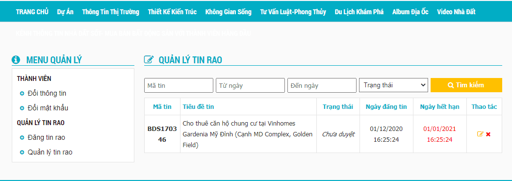 Thành viên theo dõi trạng thái tin đăng trong phần Quản lý tin rao. Có thể xóa, chỉnh sửa tin đăng.