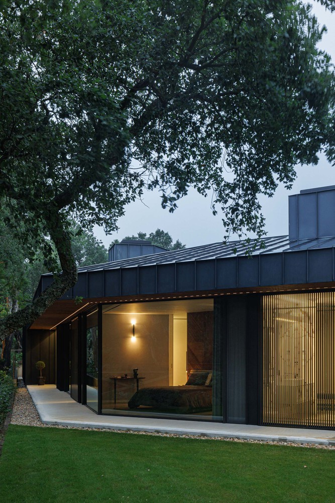 Phòng ngủ nhìn từ bên ngoài vào thời điểm chạng vạng. Ánh đèn ấm bên trong khuếch tán qua lớp cửa kính lớn, tạo hiệu ứng phát sáng nhẹ.